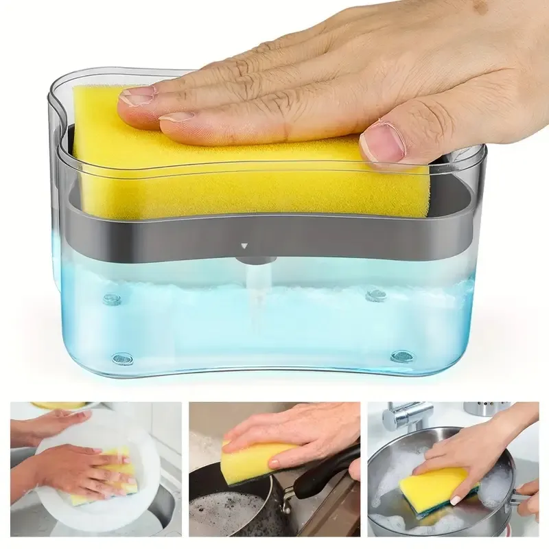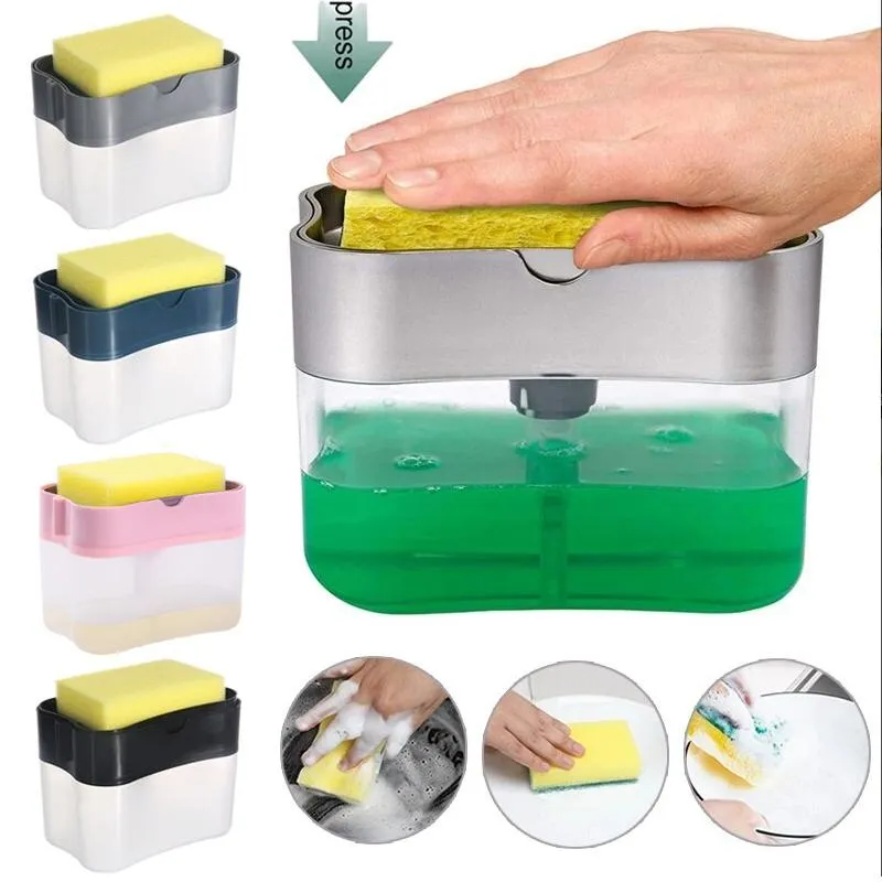 1.2 in 1 design:Soap dispenser and caddy, single hand operation. Sink dispenser with attached caddy, you can use it to hold sponges, scrubbers, rags, scouring pads in one convenient place while keeping water off of kitchen counters.
